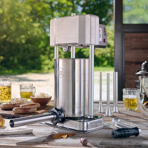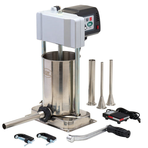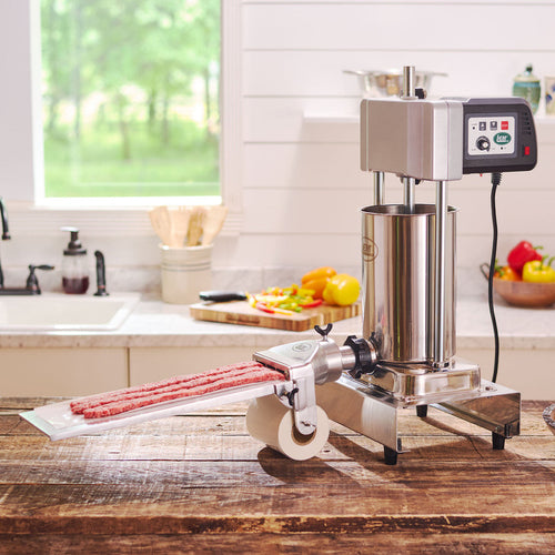 Upgrade your home food processing setup with a robust, commercial-grade stuffer made for seamless sausage-making. The BigBite® 10 lb. Motorized Sausage Stuffer is perfect for hunters, food processors, chefs, and culinary enthusiasts looking to create their own sausages. Designed to make sausage stuffing a one-person job, our motorized stuffers combine power, precision, and smart features to ensure a rewarding experience. The BigBite Motorized Stuffer offers a speed control knob, allowing you to adjust the piston's lowering speed and control the flow rate into the casing - essential when making small sausages and snack sticks. The included foot switch frees up your hands for easy operation, while the auto-up and flow-stop functionalities make stuffing even more convenient. Our sausage stuffer also has an air release valve, ensuring casings fill evenly and smoothly with fewer air pockets. The removable cylinder holds 10 lbs. and allows for hassle-free refilling. The stuffer comes with four stuffing tubes to accommodate various sausage sizes and types, including snack sticks (1/2", 5/8", 1" 1/1/4" OD). A crank handle is also included for non-motorized use.